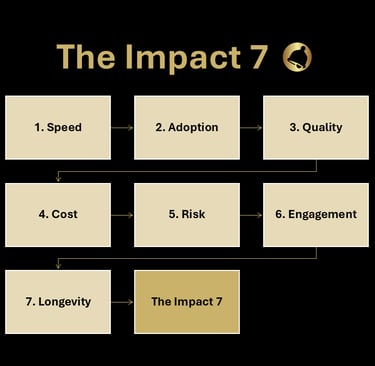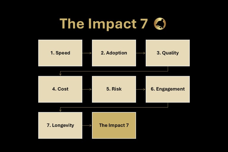 Our approach blends how we measure success (The Impact 7) with the five pillars that make change stick (The BELLS Framework). Together, they turn strategy into outcomes and outcomes into momentum.